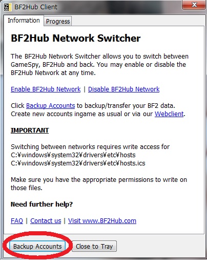 BF2Hub Clientのダイアログボックス左下「Backup Accountsをクリック。
